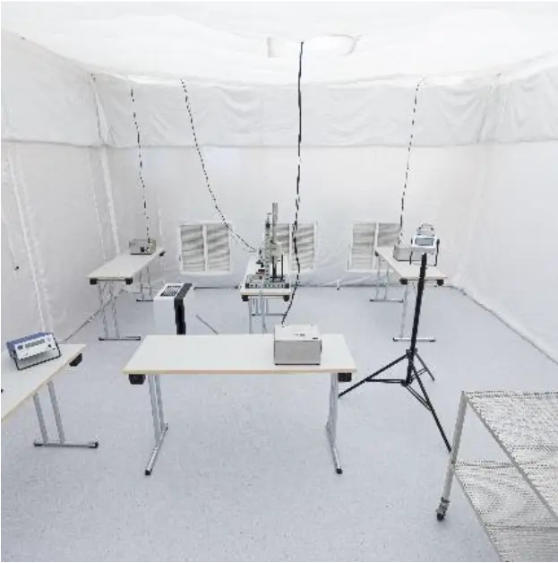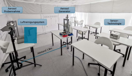 Setup for evaluating mobile air purification devices with virus surrogate aerosols in the test infrastructure created at Fraunhofer IZS in Stuttgart