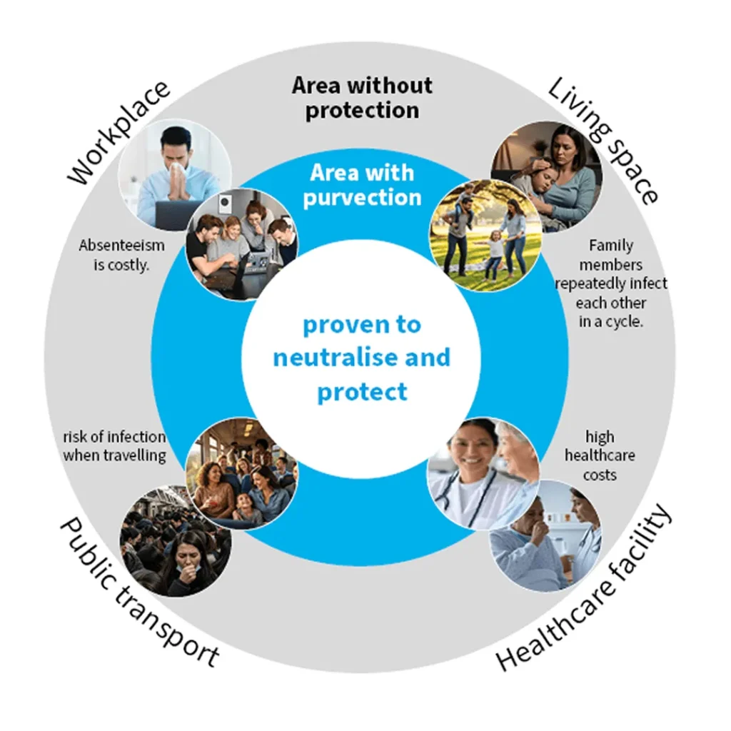 Experience how PURVECT AIR takes you out of the daily grind of illness and uncertainty and into a safe area of health and wellbeing — with 20% fewer absences for family, work and hospitals. Become a hero with our technology that protects and revitalises you!