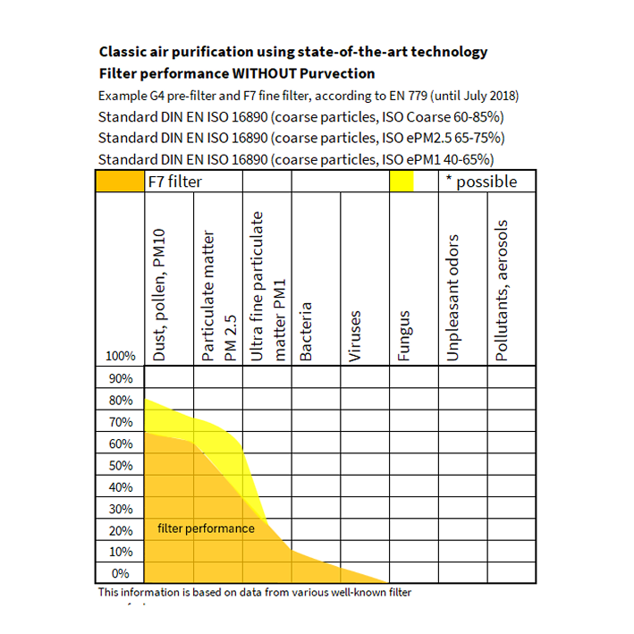Purvection inactivates pathogens and reduces gaseous pollutants, which filters cannot do and thus supplements every filter, without any side effects.